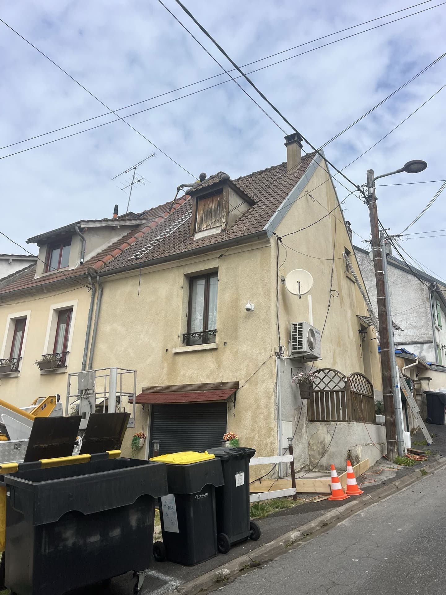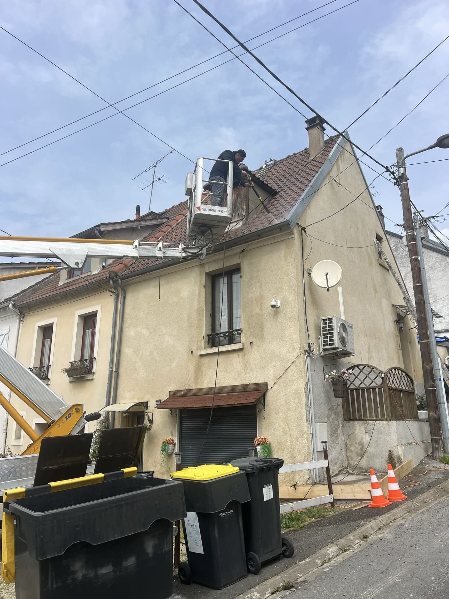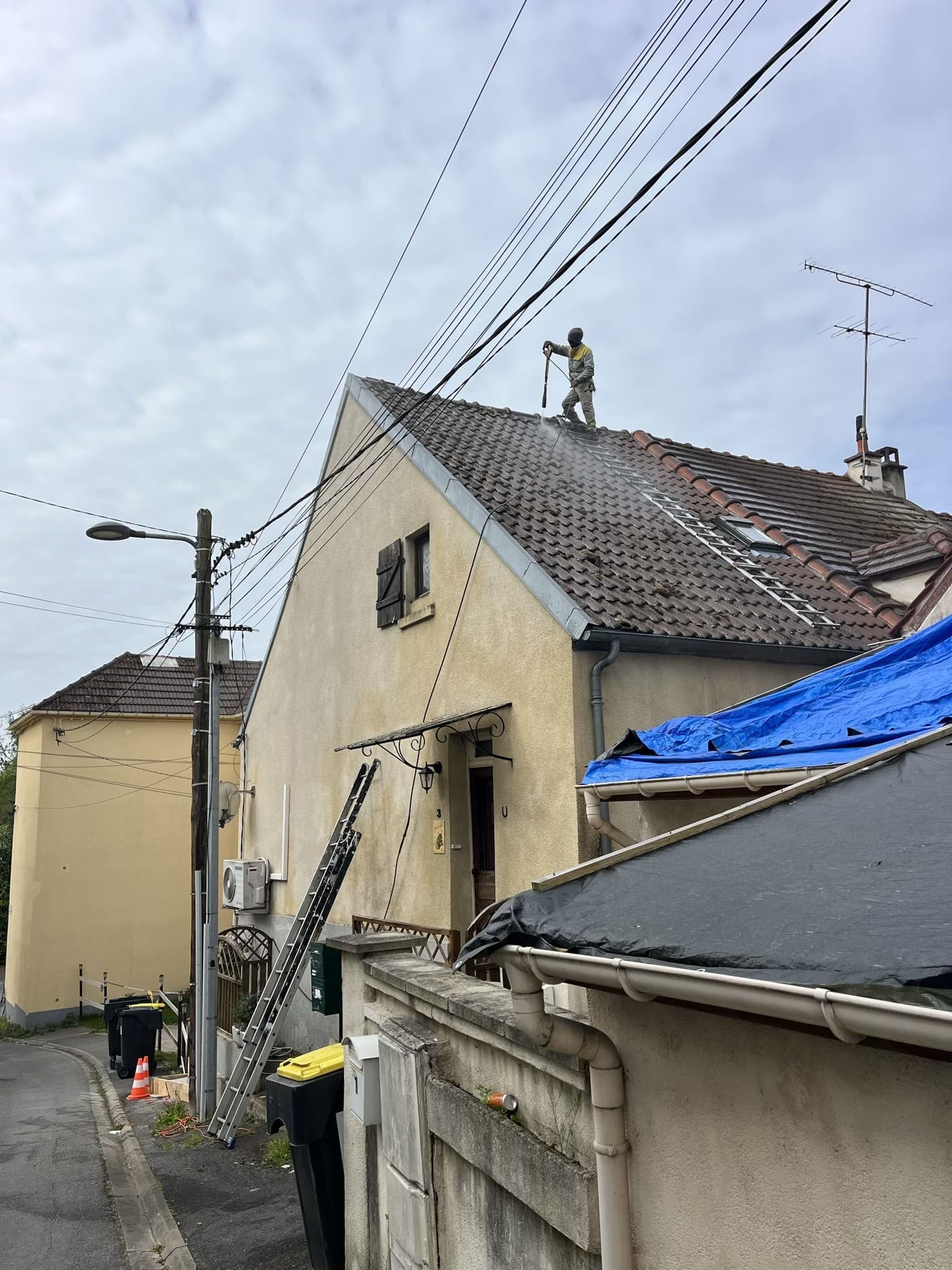Travaux de nettoyage effectués sur la toiture de cette maison de Seine-et-Marne et application d'un film hydrofuge.